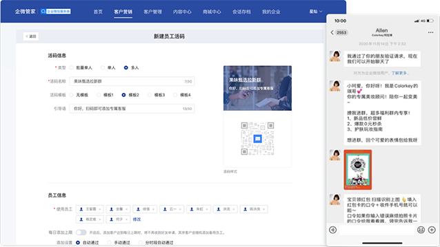 提供员工活码、客户群活码、区域活码等快速搭建企业私域客户池